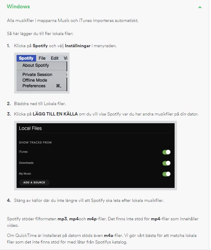 För att lägga till filer som ligger på hårddisken och inte i iTunes eller i din musikmapp så måste du lägga till din egen källa. Spotify har stöd för mp3, mp4 och m4p-filer i sin spelare för externa källor.